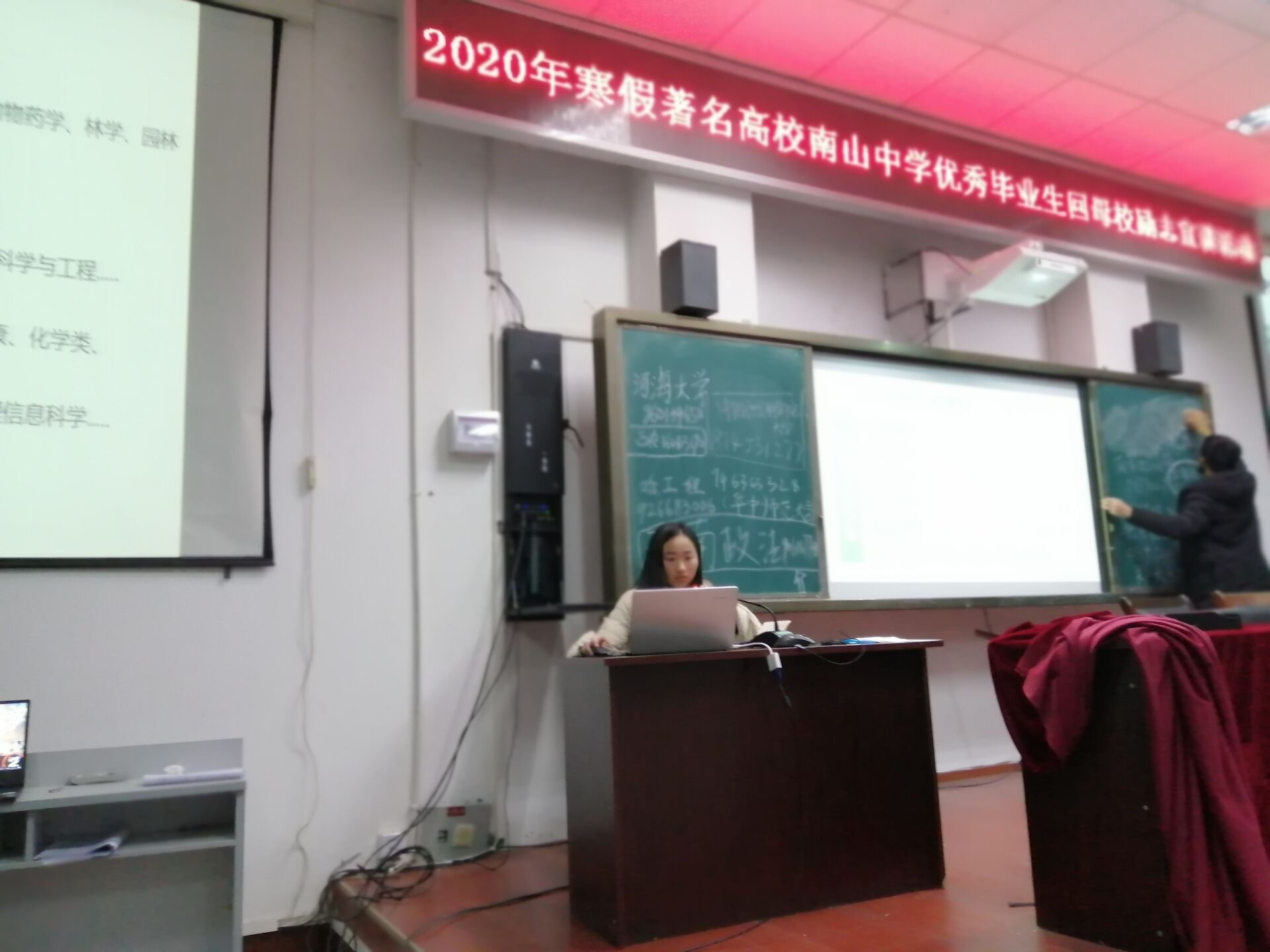 宣传演讲,激情澎湃。18日晚七点,各高校宣讲队伍的演讲环节在南山中学大礼堂进行。由来自草业学院的林思雨同学上台演讲,她首先通过ppt为在坐的高三学子介绍了公司的基本背景和专业概况,随后分享了自己的老员工活,最后是提问环节,作为一名高考“过来人”,她为学弟学妹们分享了自己的学习、复习经验。最后,她为学弟学妹们表达了祝愿:“高三加油,高考必胜!”